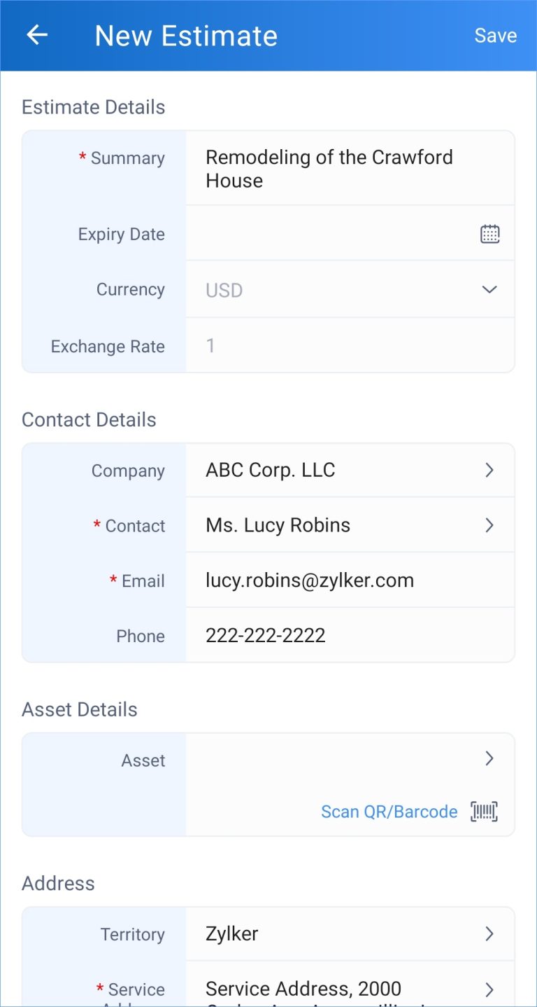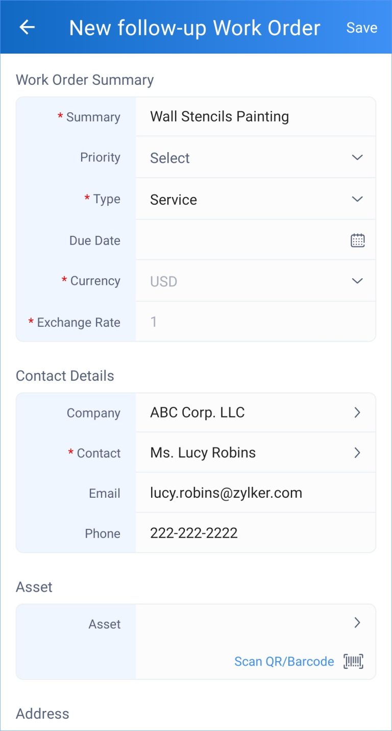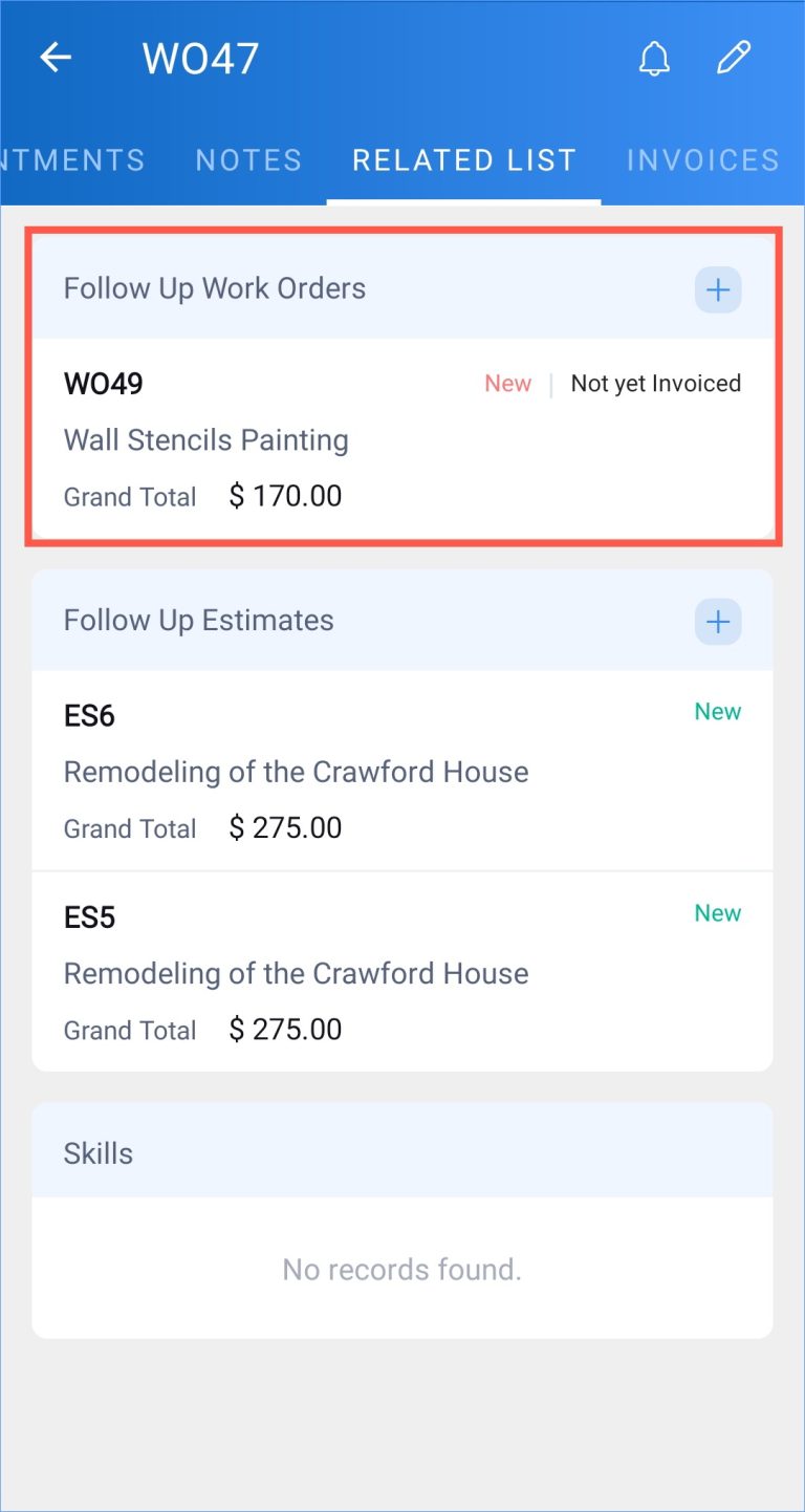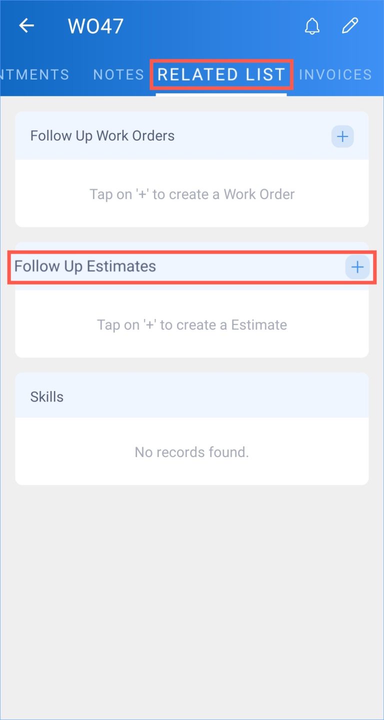 Follow-up Work Order and Estimate in Zoho FSM Summary You can create a follow-up work order or estimate for an work order.To create a follow-up work order:Select the Related List tab of the work order you want to add the follow-up work order to. Click + for Follow Up Work Orders. In the New follow-up Work Order page, enter the necessary details and click Save. The created follow up work order will be listed under the Related List tab. To create a follow-up estimate:Select the Related List tab of the work order you want to add the follow-up estimate to. Click + for Follow Up Estimates. In the New Estimate page, enter the necessary details and click Save. The created follow up estimate will be listed under the Related List tab. Zoho FSM Request Support