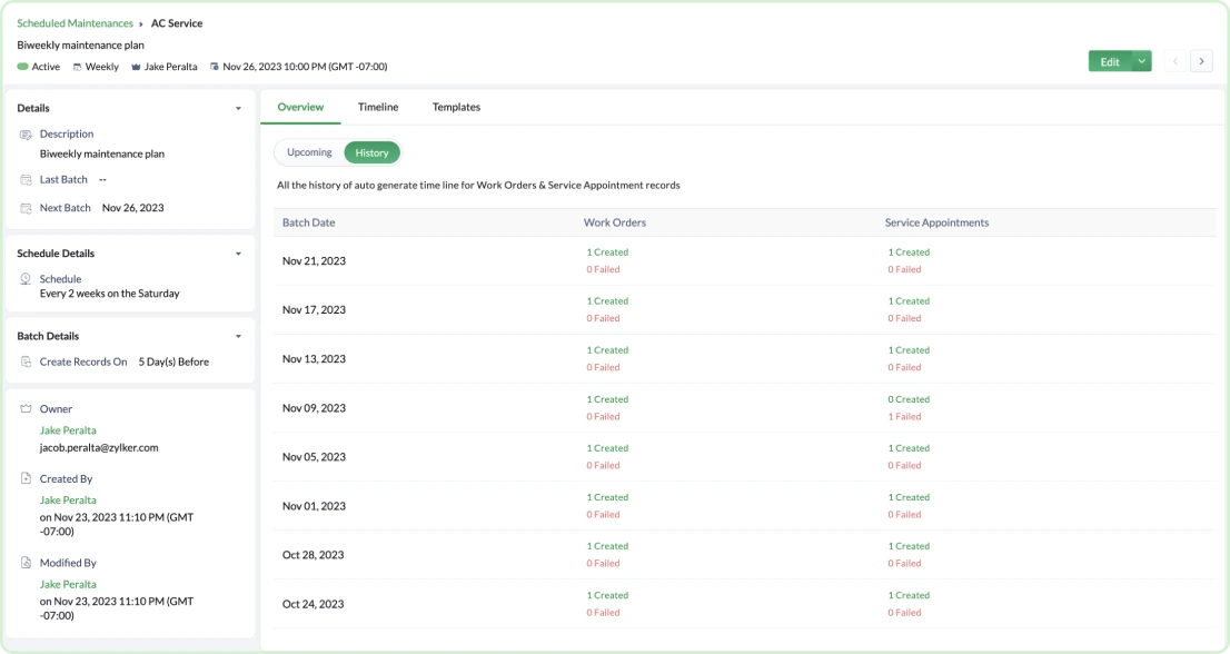 Zoho Field Service Management (FSM)’s scheduled maintenance feature allows you to set up periodic maintenance plans, schedules, and work order templates and more with ease.