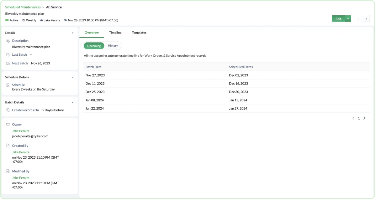 After entering all the details of the scheduled maintenance, you can see a preview of the selected dates on the calendar to verify the plan. You can also click on any maintenance plan to see the five upcoming batch and schedule dates.