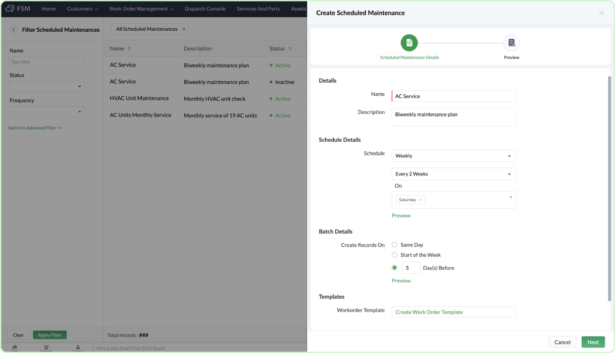Set up a schedule for regular maintenance activities. Choose between a daily, weekly, or monthly interval for the frequency of the service. You can also select a particular day of the week or date in a month. Add batch details by specifying when the work order and service appointments for these services need to be generated.