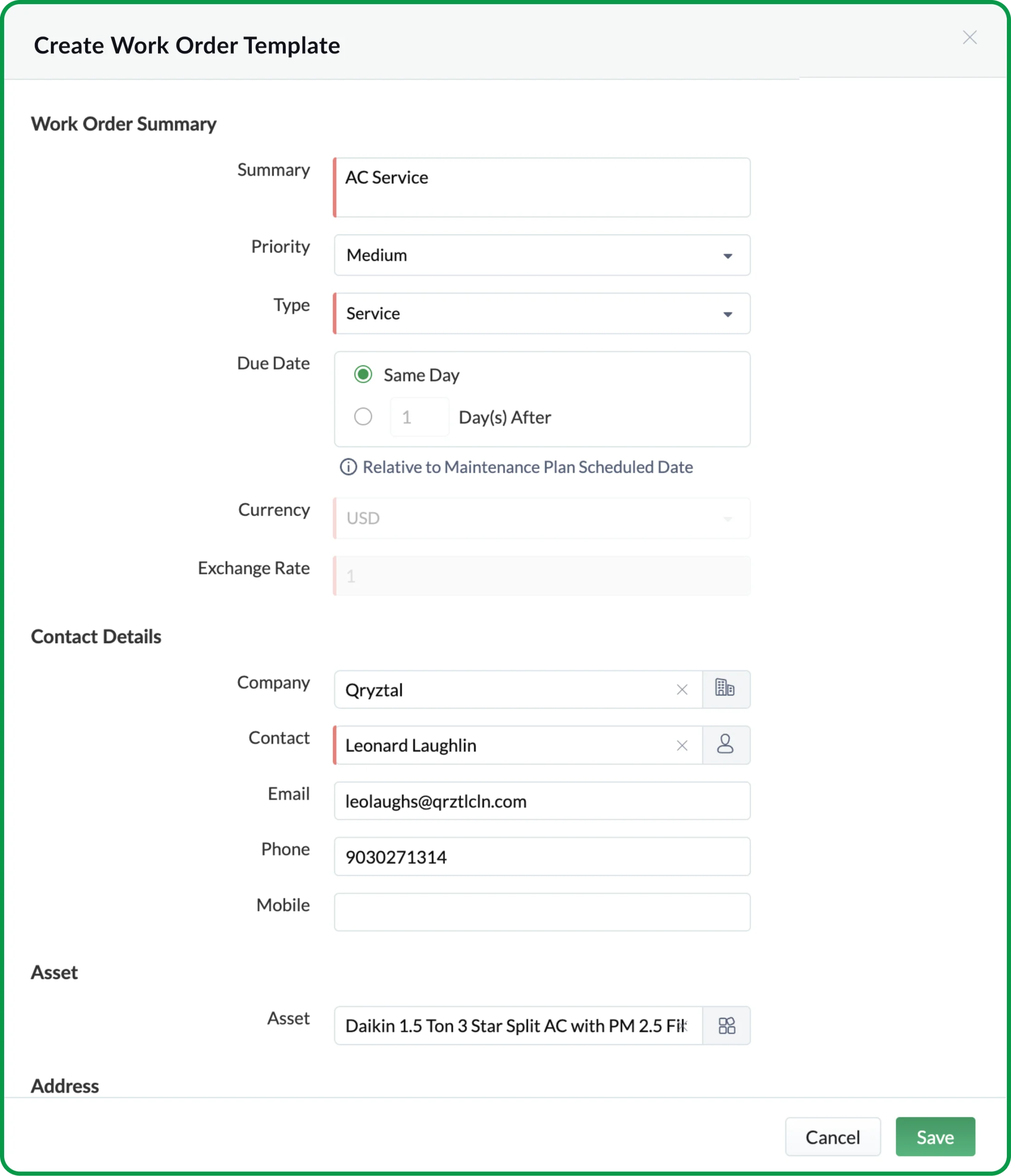 The service appointment template lets you specify the date and time for scheduling the maintenance activities. Fill out the start and end times for the job corresponding to the date in the maintenance plan. Once saved, view it in the templates tab.