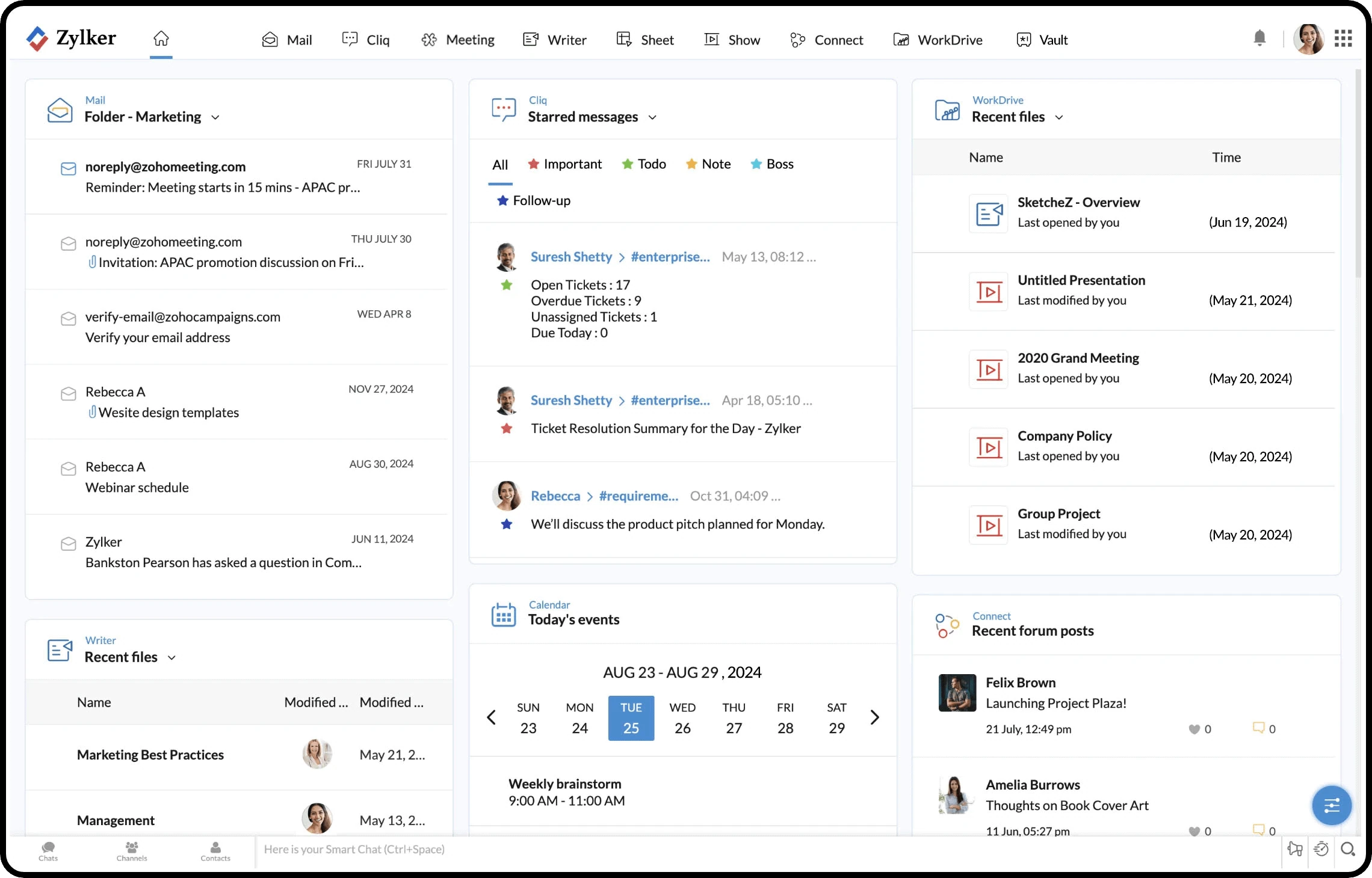 Zoho Workplace is a productivity and collaboration suite trusted by millions. It brings mail, chat, files, office suite, meetings, and more into one place.