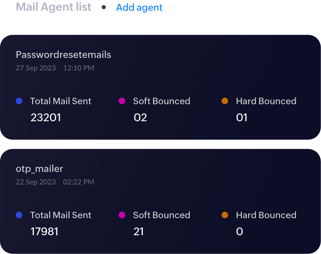 If you run multiple businesses, applications, or send different types of transactional emails, having them cluttered together can be chaotic. With ZeptoMail, you can segment emails into streams by using Mail Agents. Each group comes with its own analytics and credentials.