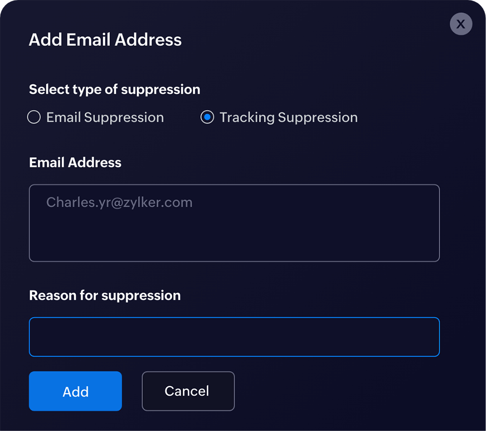 Having too many bounces or spam complaints can affect the delivery of your transactional emails. The suppression list in ZeptoMail allows you to block sending and tracking for specific email addresses that cause bounces, so you can protect your reputation.